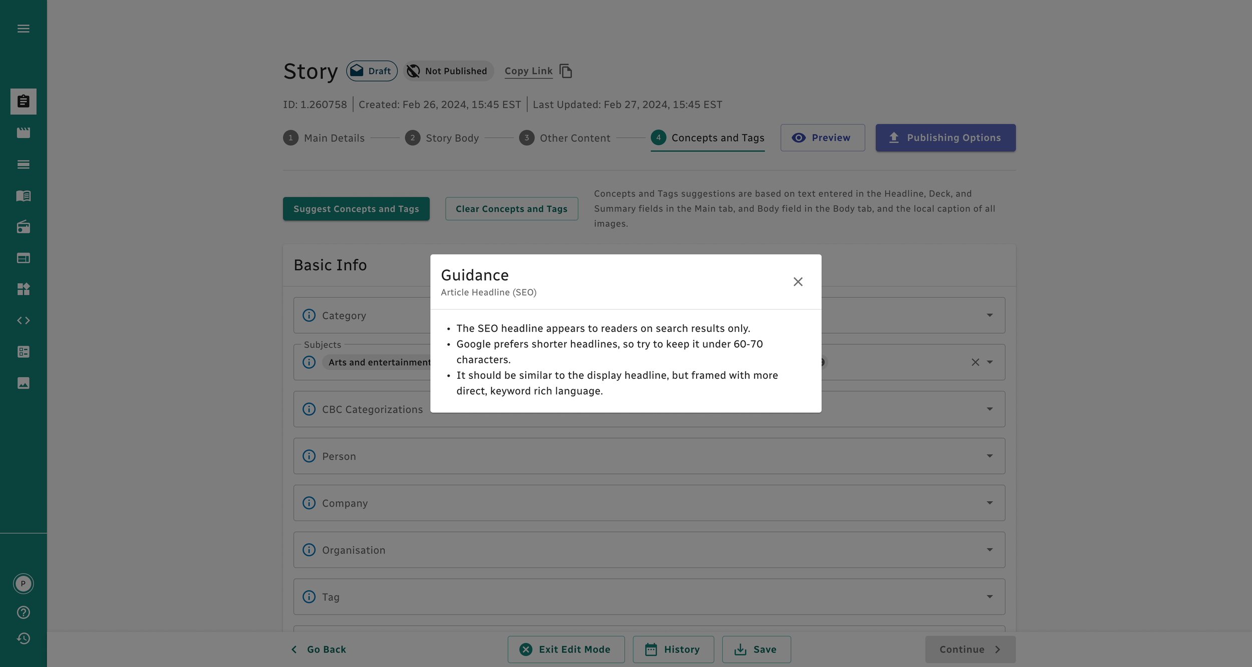 I wanted to add in support for users that wasn’t just limited to “how to use this feature” but baked in real guidance for producing stories based on lead producers’ decisions. I designed the “Guidance” feature that places blue info buttons next to fields where users can click to get more information about best practices. A popup appears that guides the user with best practices and tips. We made this in collaboration with the content leads who wrote and signed off of all of the guidance text.