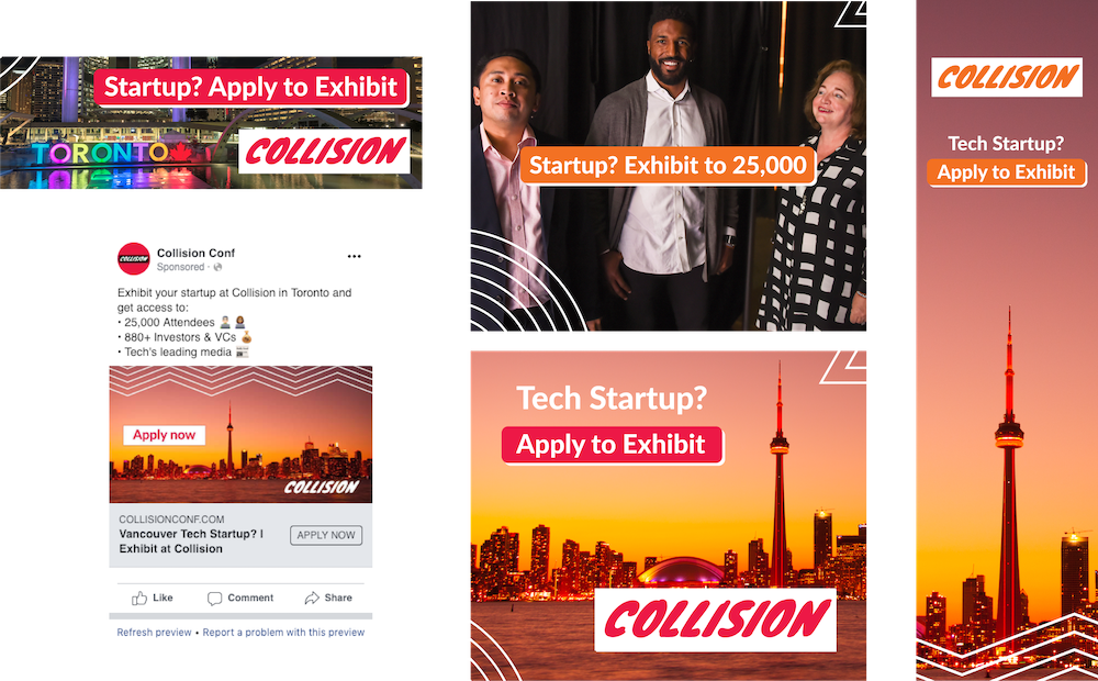 Collision is the fastest-growing tech conference in North America with over 25,000 attendees in its last year. I created graphics for their 2019 conference targeting tech startups through social media and banner advertising. The ads team and I collaborated to create CTAs and desired messaging for the graphics. We worked iteratively together based on my suggestions and the team's feedback on what I'd produced. Given that the conference was located in Toronto, Canada, for the first time in its history, a special emphasis was placed on making clear the city Collision was making its home. I worked with their already existing design guidelines to create advertising that fit seamlessly with their brand.